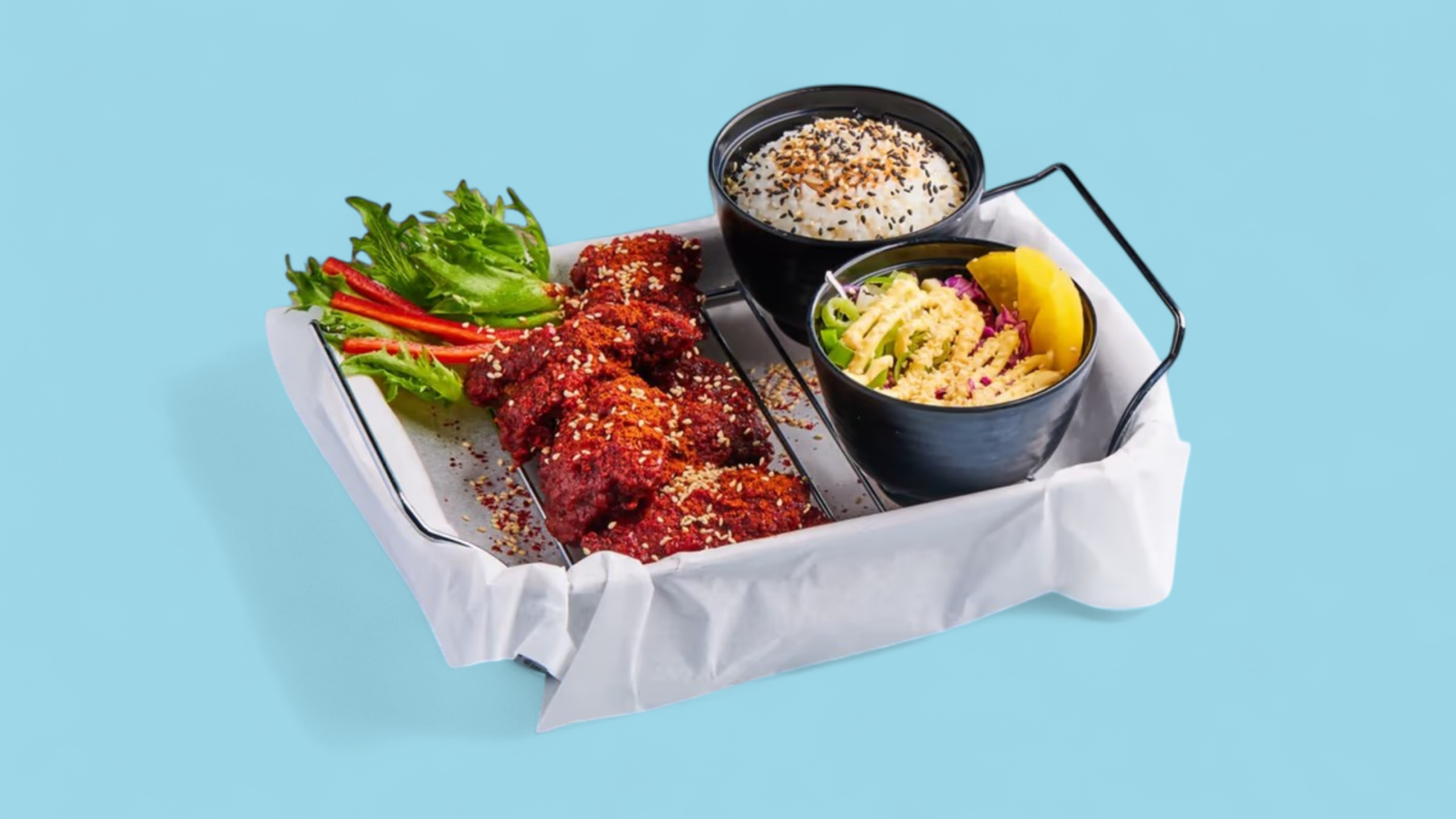 Hjemmelaget yangnyeom-glaze som er søt, syrlig og ekstremt sterk med Carolina Reaper-chili. Carolina Reaper har en gjennomsnittlig Scoville-verdi (SHU) på 1 641 000, og enkelte chilier kan nå helt opp til imponerende 2 200 000 SHU. Dette er verdens sterkeste chili. Serveres med syltet reddik og asiatisk coleslaw. Velg mellom ris eller steak fries.